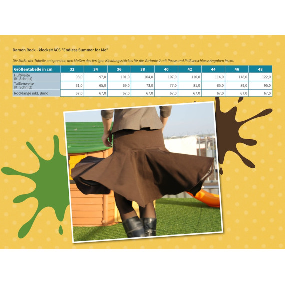 Dieses klecksMACS E-Book beinhaltet die bebilderte Nähanleitung, sowie das Schnittmuster für den Rock in den Größen: