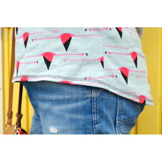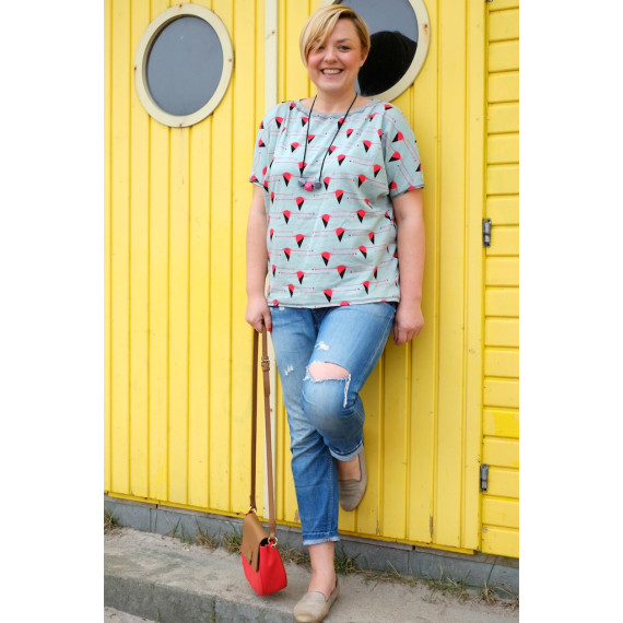 Das Kurzarmshirt Frau Edda ist ein lässiges Oberteil, das aus nur zwei Teilen besteht und deshalb sehr schnell genäht ist! Die überschnittene Schulter und der runde Saum, der hinten etwas länger ist, machen Frau Edda zu einem stylischen Begleiter für den Alltag oder auch schick gestylt zum Blazer. Das Schnittmuster gibt es in den Größen S – XXL.
