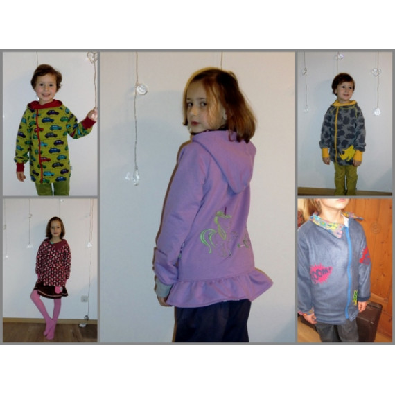 Die Jacke ist für dehnbare Stoffe wie Jersey oder Sweat ausgelegt. Wer besonders dicke Stoffe wie Fleece oder unelastische Stoffe wie z. B. Feincord verwenden möchte, wählt ggf. ein bis zwei Nummern größer. Für das Futter empfiehlt sich Jersey. Wer jedoch die Jacke aus unelastischen Stoffen näht, sollte auch für das Futter zu unelastischen Stoffen greifen.