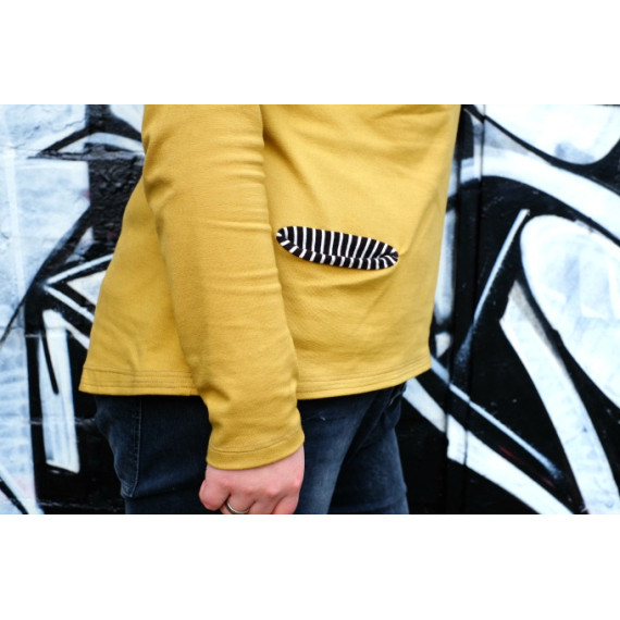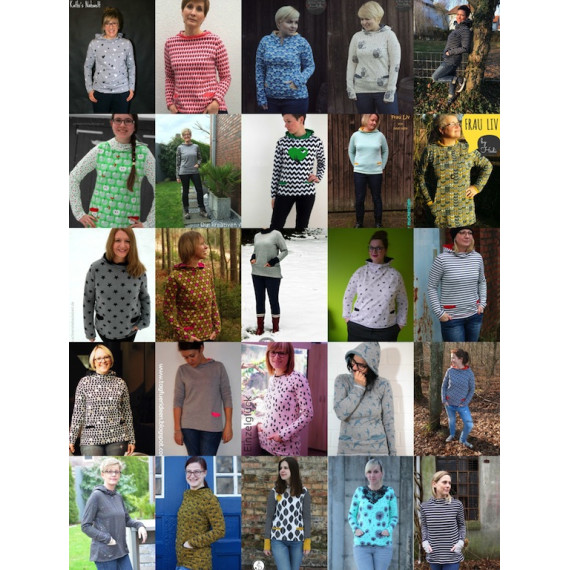 Das Kapuzenshirt Frau Liv ist ein cooler Pullover mit ganz besonderen Beuteltaschen. Du solltest ihn aus elastischen, dünneren Stoffen wie Jersey oder Interlock nähen, damit er einen optimalen Sitz hat. Die Kapuze wird vorne im Bruch zugeschnitten und macht Frau Liv so zu einem unkomplizierten Lieblingspullover für Damen. Der Saum ist hinten etwas länger als vorne, so dass der Po halb bedeckt ist.