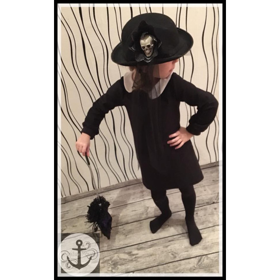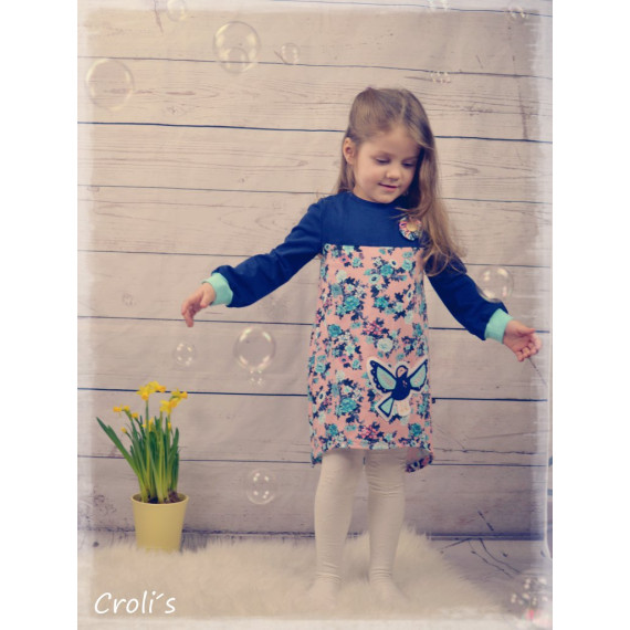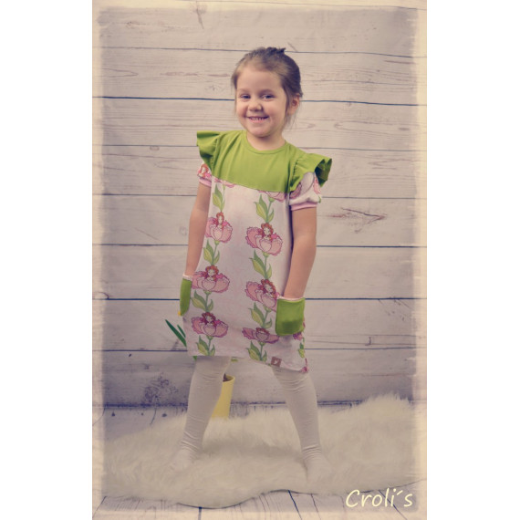 Das Kleidchen hat leichte „Trompeten-Ärmel“, eine Unterteilung im Vorderteil,aufgesetzte Taschen und