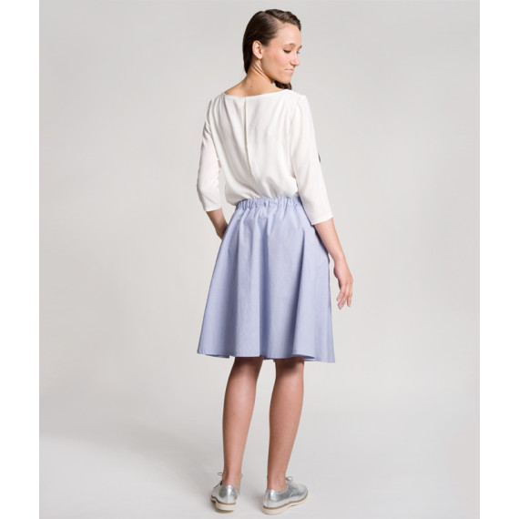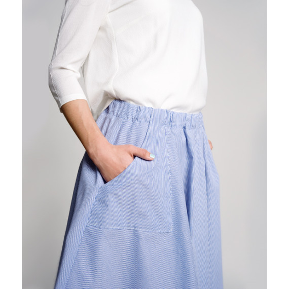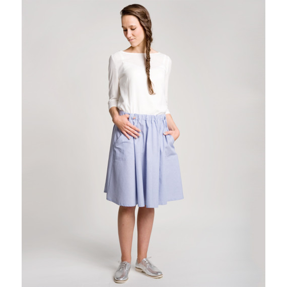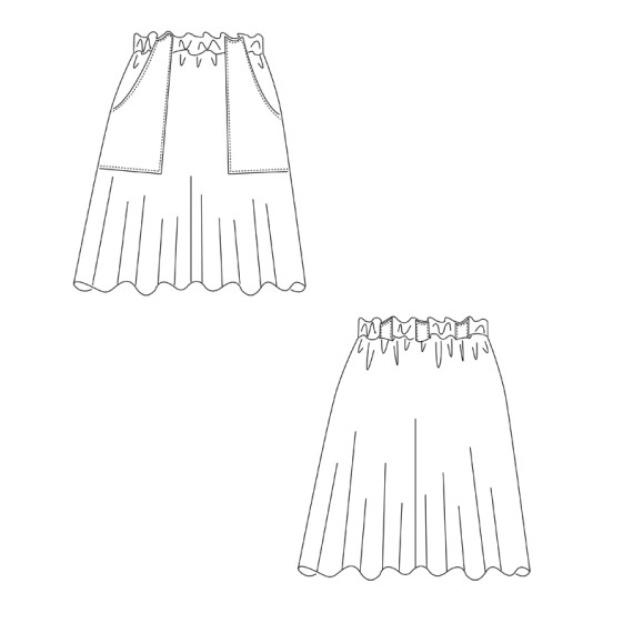 Der Rock Elsa ist ein weiter Rock mit Gummibund. Die zwei aufgesetzten Taschen im Vorderteil dienen zugleich als Gürtelschlaufen. Schnittmuster Rock Elsa ist einfach zu nähen.