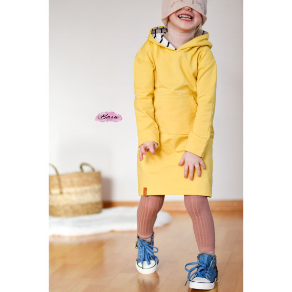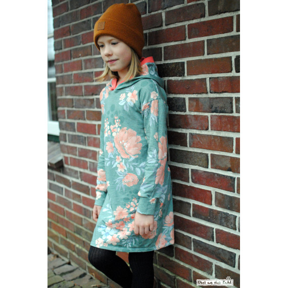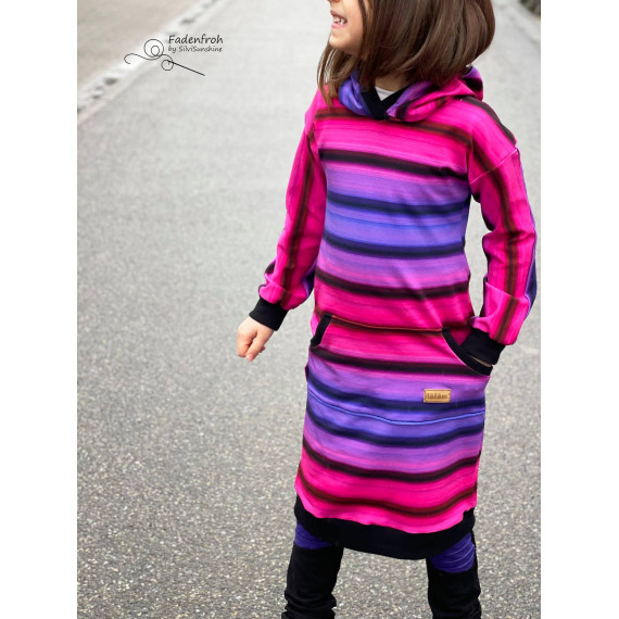 Das locker geschnittene Bequemkleid hat eine gerade Form, welche für einen lässigen und sportlichen Look sorgt. Je nach Stoffwahl kann es aber auch super süß oder klassisch wirken. Die Ärmel beginnen hier etwas weiter außen und weisen auf der Oberseite eine Ziernaht vor. Mit dieser Ziernaht kannst du z. B. durch Rüschen, Spitze oder einfach durch eine abgesetzte Naht ein tolles Highlight setzten! Eine weitere Gestaltungsmöglichkeit bietet dir die Kangarootasche, welche du optional verwenden kannst. Mit der Kangarootasche ist der sportliche Look perfekt. Die Länge des Kleides würde ich als mittellang bezeichnen, genau richtig um es zu Leggins oder Strumpfhose zu kombinieren. Das Bequemkleid ist perfekt für verspielte Nachmittage oder um einfach nur schick und cool gekleidet zu sein. Durch die gerade Form kommen übrigens auch Panels richtig toll zur Geltung!