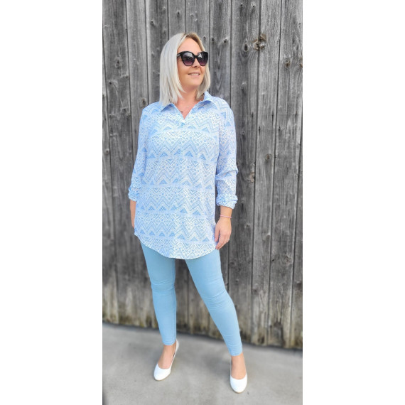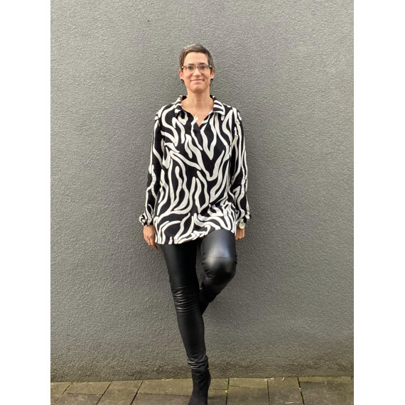 Du erhältst das Blusenshirt in den Größen 34-54 und kannst zwischen verschiedenen Ausführungen wählen. Der elegante Kragen und der V-Ausschnitt mit Blende verleihen der Bluse eine raffinierte Note.