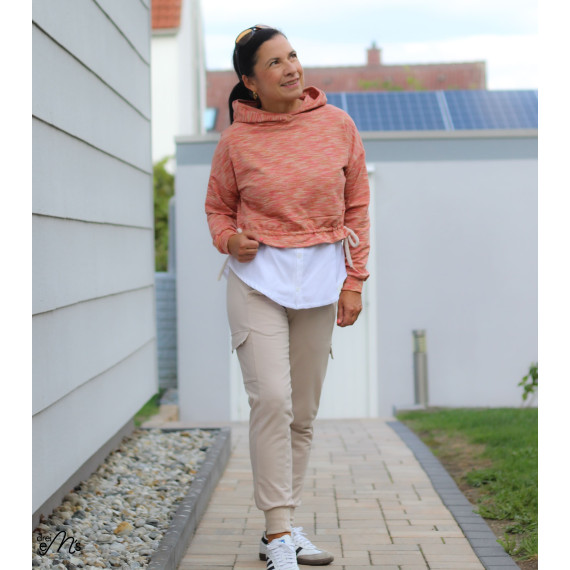 Du bekommst den Hoodie in den Größen 34-56 und in den Längen: Körpergröße: 1,58m, 168m. Falls du größer als 1,68m sein solltest, kannst du durch die nicht komplizierte Schnittführung auch komplikationslos verlängern, was auch mit in der Anleitung erklärt ist.
