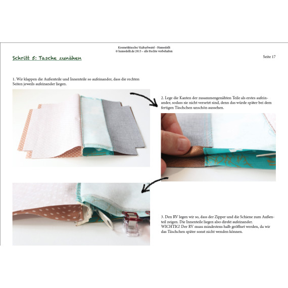 In dieser Anleitung zeige ich dir Schritt für Schritt, wie du in nur 1-3 Stunden ein kleines Kosmetiktäschchen oder auch einen großen Kulturbeutel nähen kannst. Das Ebook ist mit seinen detaillierten Beschreibungen und über 120 Fotos sehr anfängerfreundlich gestaltet.
