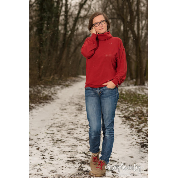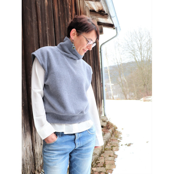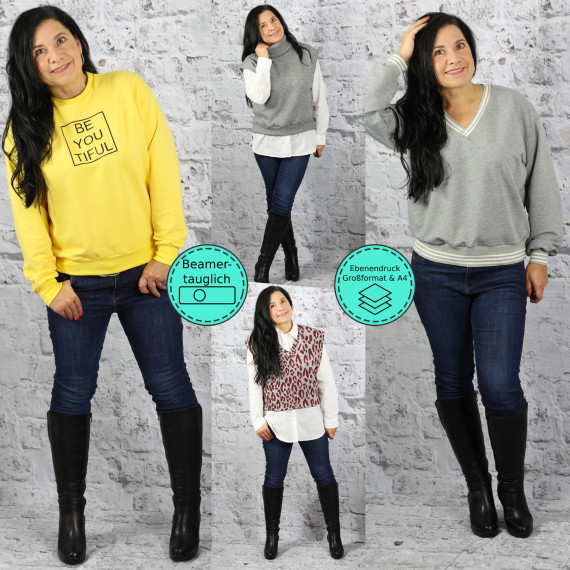 Der Schnitt SCHENNA ist ein Mix & Match Schnitt. Du kannst alle Halsausschnittvarianten untereinander kombinieren, sowie entscheiden ob du einen Sweater oder Pullunder möchtest.