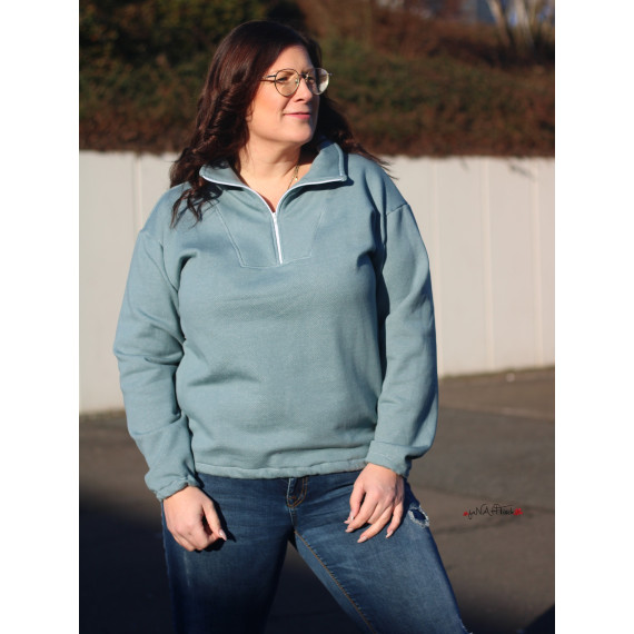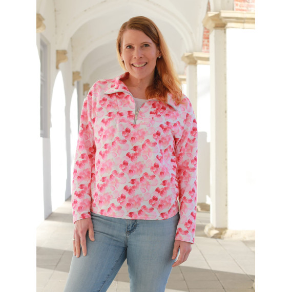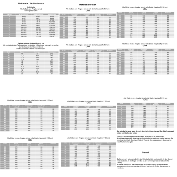 Es stehen dir zwei Ärmelweiten zur Verfügung. Im Schnitt sind drei Längen enthalten. Die Ärmel und den Bund kannst du säumen, mit Bündchen oder Gummizug nähen.