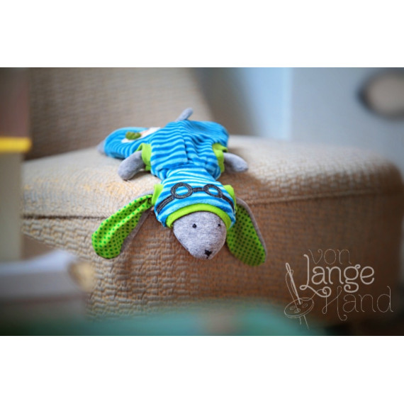 Rustling foil sewn in the belly of the bunny leaves little explorers prick up their ears. And if you like it even noisier, sew a rattle or a squeaker in the bunnies head. The back of the dress or pants leaves space for decoration. If you like, appliqué healthy vegetables or choose a typical heart or a star. The tutorial comes with three patterns.
