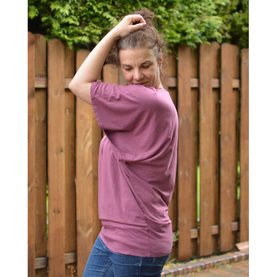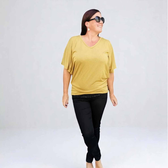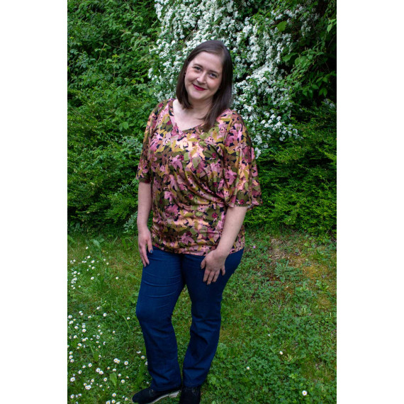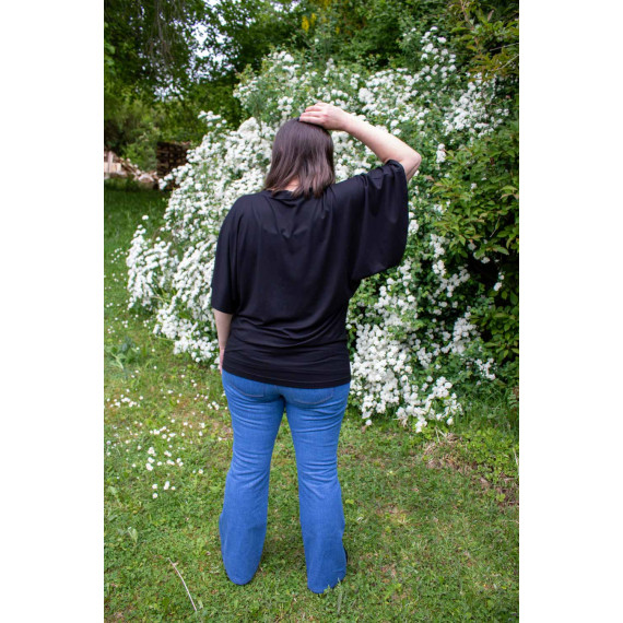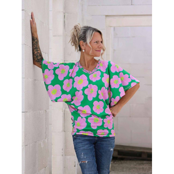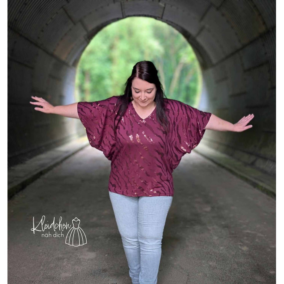 Zusammengefasst: Dieser Schnitt bietet dir ein Fledermausshirt mit V-Ausschnitt und kurzen, weiten Ärmeln, etwas länger als hüftlang, so kannst du es wunderbar hochschoppen.