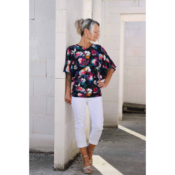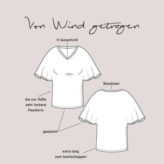 Unkompliziert, luftig und zugleich feminin, das ist „Von Wind getragen". Der tiefe V-Ausschnitt betont sanft das Dekolleté, während die weiten, kurzen Ärmel dem Shirt seine besondere Silhouette verleihen. Genäht aus weichem Jersey umspielt es locker die Figur. Ob lässig zur Jeans, elegant zu Rock oder als Strandbegleiter: „Vom Wind getragen“ ist ein treuer Begleiter für all jene Tage, an denen du dich vom Leben tragen lassen möchtest.