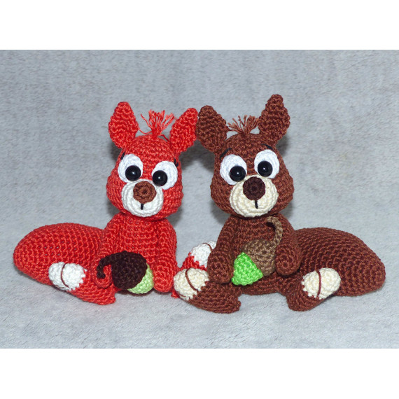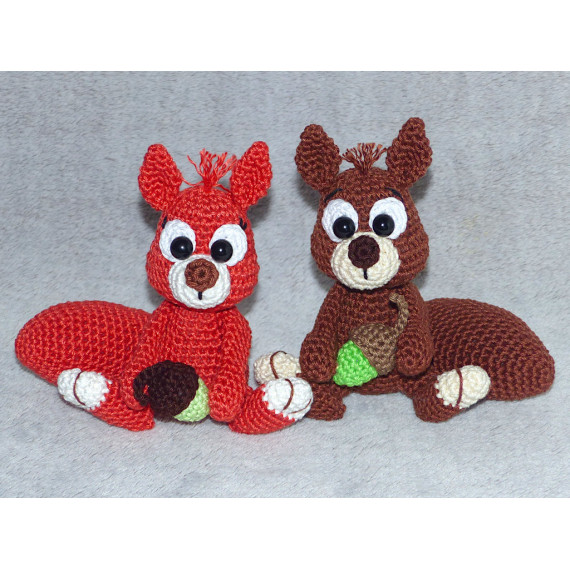 Solltet ihr eine komplett andere Wolle nehmen, dann beachtet bitte: Je nach Garn- und Häkelnadelstärke variiert die Größe von den Eichhörnchen.