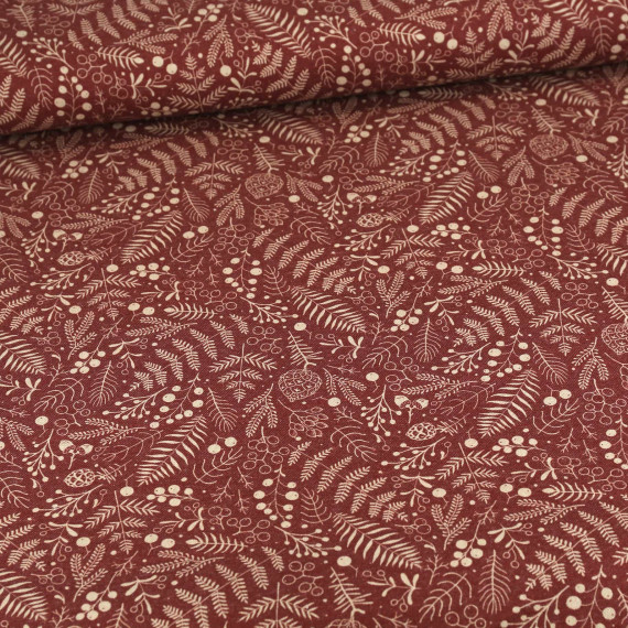 Half Panama Premium - Baumwolle - Leinenoptik - Kleine Blätterzweige - Bordeaux