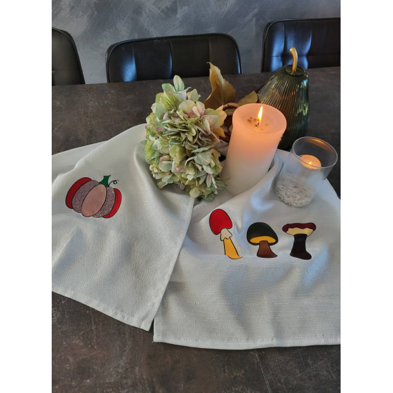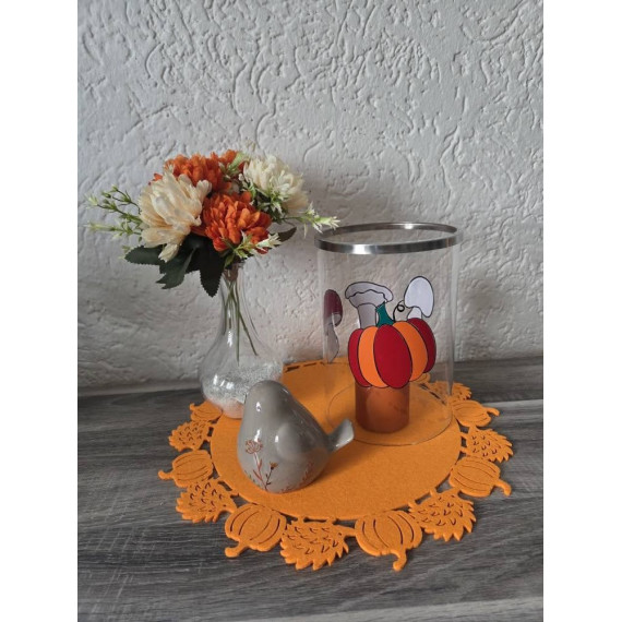 - Kürbis als Blickfang auf Tischläufer, Deko-Kissen, Wandbild oder Laterne.