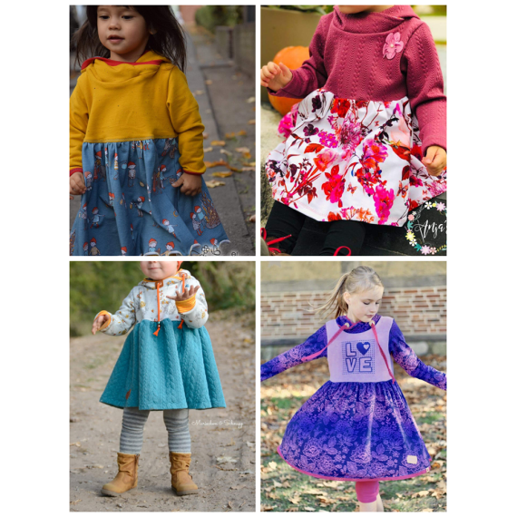 Ebook enthält die bebilderte Nähanleitung für das weit schwingende Hoodiekleid Schatzi , mit Wickelkapuze und gerafftem Rockteil.
