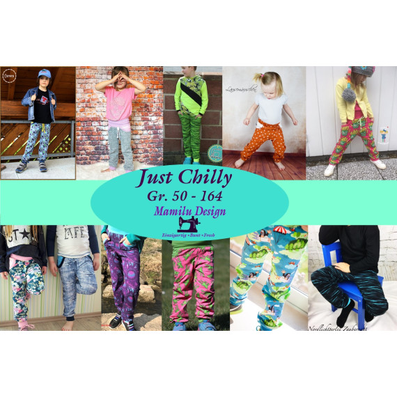 "Just Chilly " ist ein lässiger Hosenschnitt für alle Lebenslagen. Ihr habt die Wahl, ob ihr mit oder ohne Taschen, bzw. Patches näht. Der Schnitt ist sowohl für Jersey und Sweat, als auch für festere Stoffe wie Jeans, Baumwolle, Cord oder Softshell geeignet. Just Chilly ist absolut anfängertauglich und wunderbar wandelbar. Im Schnitt sind in der normalen Version die Einzelgrößen 86 – 164 enthalten. Außerdem gibt es eine Windelversion in den Einzelgrößen 50 -104. Wie man die Taschen anbringt wird in einem Tutorial von Henriette von Sticheltrine erklärt.