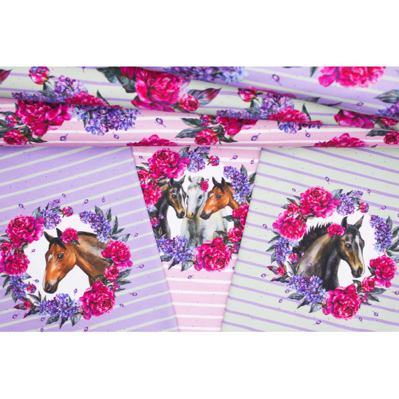 Wunderschönes Jersey Paneel in Bio Qualität von abby and me. Dieses Stöffchen ist perfekt für echt Pferde Fans :) Hier mit einem fliederfarbenen Hintergrund mit zarten mintfarbenen Streifen.