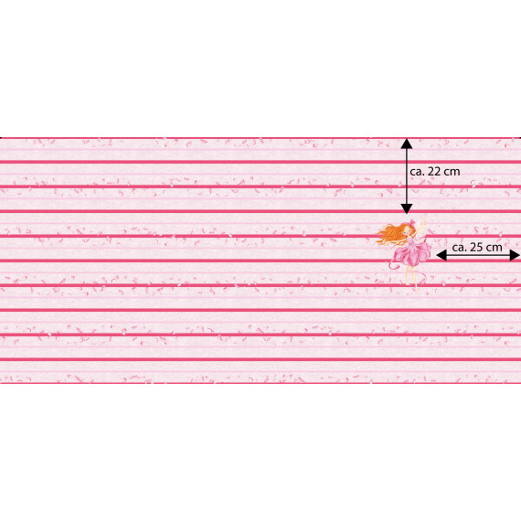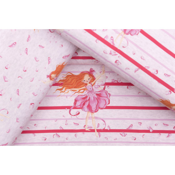 Hach, wir sind wieder verzaubert. Dieses Mal gibt es eine süße Tänzerin auf einem zart rosa melierten Hintergrund. Streifen und kleine Blütenblätter zieren ebenfalls das Stöffchen :)