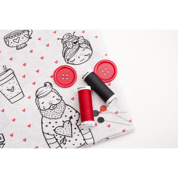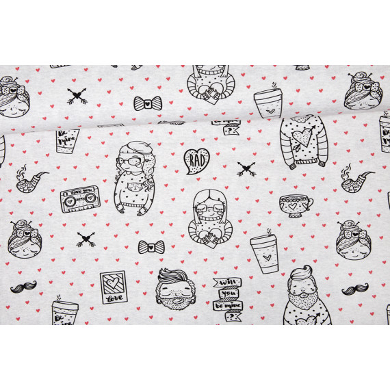 Wunderschöner Jersey mit verliebten Hipstern. Hier auf einem grau melierten Hintergrund mit kleinen roten Herzchen :)