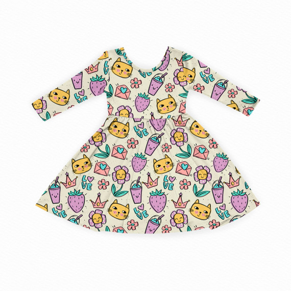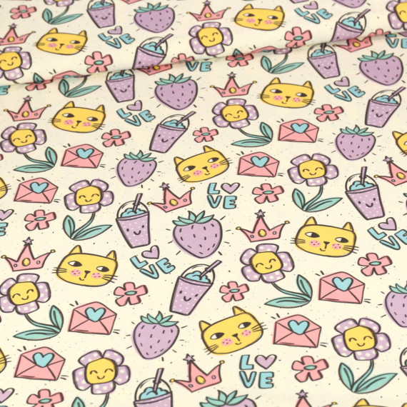 Wundervoller Jersey mit leicht abstrakt dargestellten Erdbeeren, Blüten, Kronen und Katzengesichtern! :)