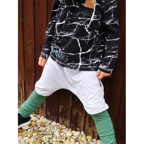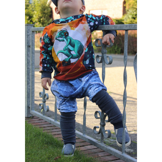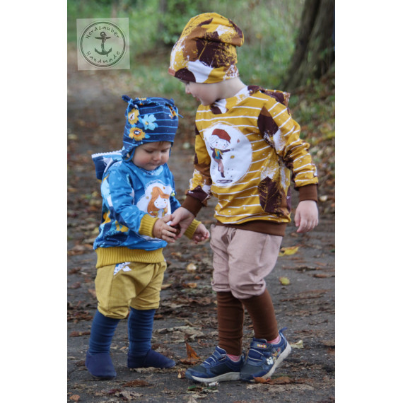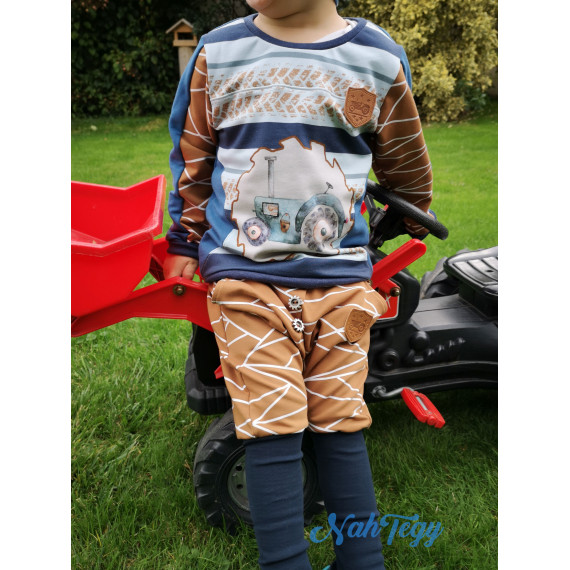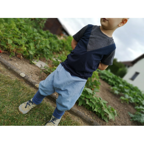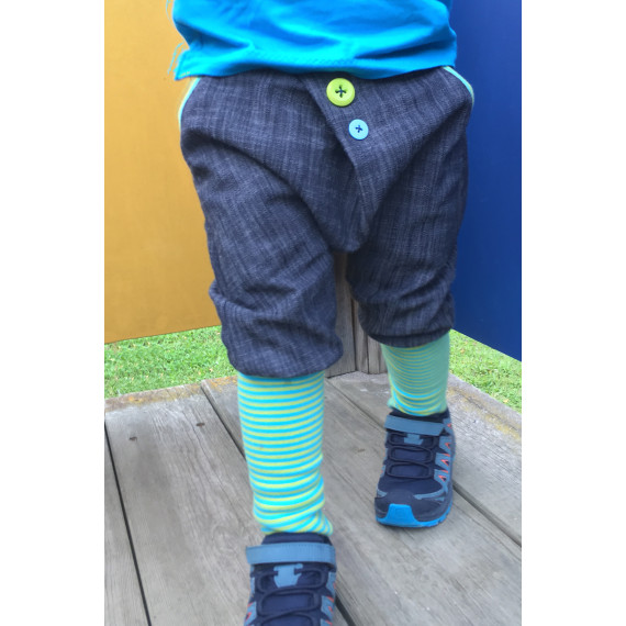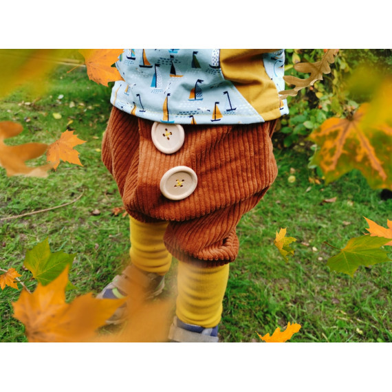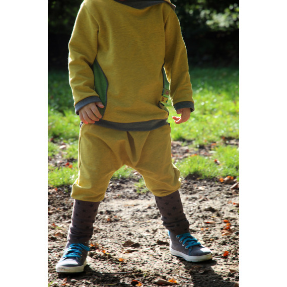 „Kalle“ ist eine lässige Knickerbocker, die sowohl aus dehnbaren Stoffen, aber auch aus weicher Webware genäht werden kann. Hosentaschen sorgen dafür, dass man allerlei Naturschätze darin verstauen und sicher mit nach Hause bringen kann. Im vorderen Bereich gibt es eine coole Überlappung, die für den bekannten Knickerbocker-Look sorgt. Die Hose kann sowohl kurz, als auch in einer langen Version genäht werden.