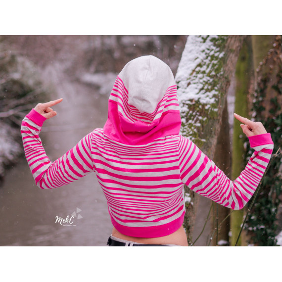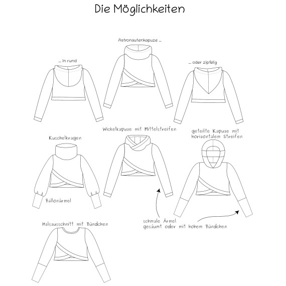 Der „KaPUHzenPulli“ ist ein lässiger Kurzpullover mit Crossover-Vorderteil und vielen Gestaltungsmöglichkeiten. Du kannst zwischen vier unterschiedlichen Kapuzen, einem kuscheligen Kragen und drei Ärmelvarianten wählen.