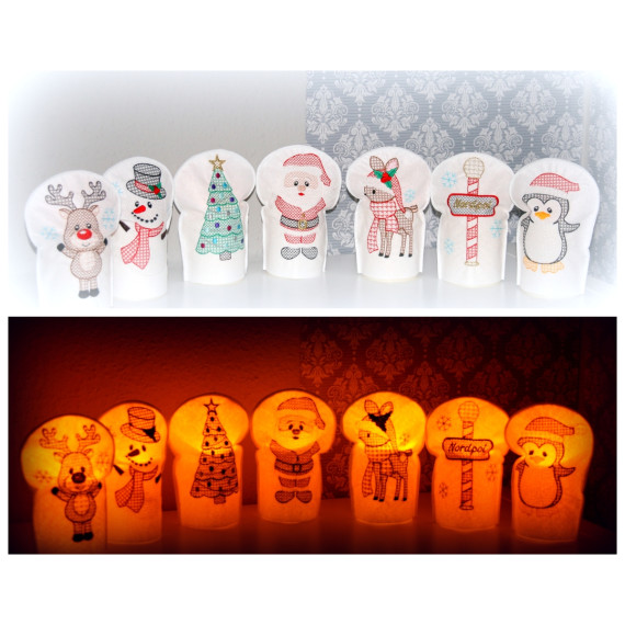 +In diesem Set sind 7 verschiedene Stickdateien als LED Kerzen Cover enthalten. Die genaue Motiv-Übersicht dieses Sets seht Ihr auf dem zweiten Bild.