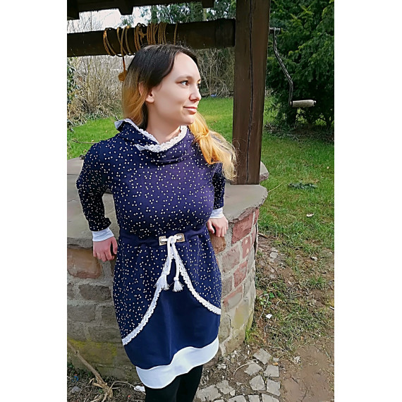 Hingucker ist der Mittelteil mit den Ösen und Kordeln – die Kordeln werden hierbei in den Seiten mit eingenäht. So kannst du, wenn du magst, den Schnitt auch etwas taillierter tragen, indem du die Kordel vorn einfach etwas mehr zusammenziehst und dann bindest.