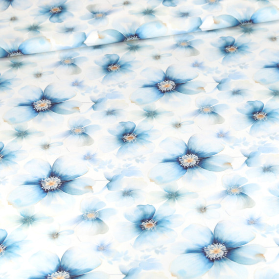 Wundervoller Modal Jersey mit blauen Blumen im Aquarell-Stil.