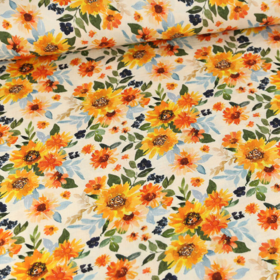 Ein wundervoll weicher Musselin mit aufgedruckten Sonnenblumen im Aquarell-Stil! :)