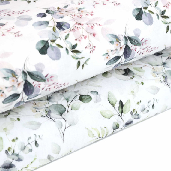 Wundervoller Double Gauze Musselin mit einem aufgedruckten Eukalyptus- und Blütenzweigen