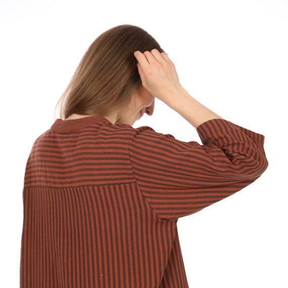 FRAU LUNA – für alle, die auch im Schlaf stilvoll gekleidet sein möchten. Das kniebedeckte Nachthemd besticht durch einen abgerundeten Saum mit Seitenschlitzen. Der V-Ausschnitt mit breiten Blenden und zarter Falte setzt elegante Akzente. Hinten formt eine Passe die Silhouette und eröffnet Platz für Musterspielereien. Zwei Ärmellängen machen es perfekt für jede Jahreszeit.