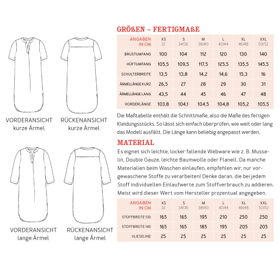 - Materialempfehlung: leichte, locker fallende Webware wie z. B. Musselin, Double Gauze, leichte Baumwolle oder Flanell