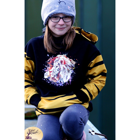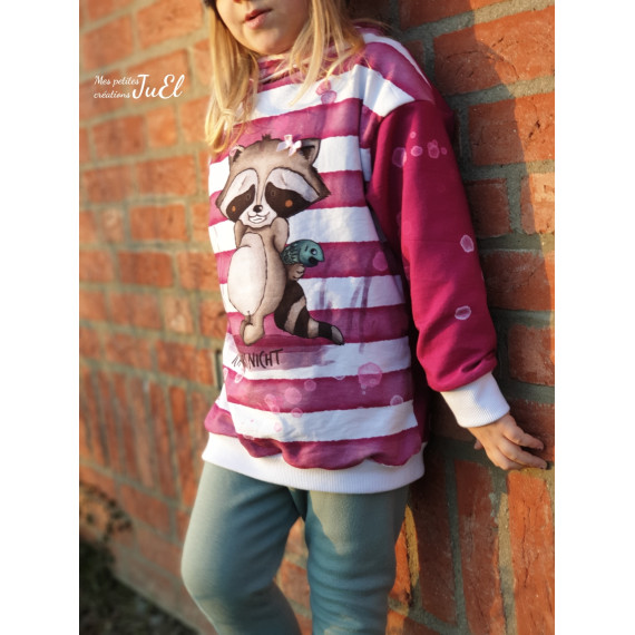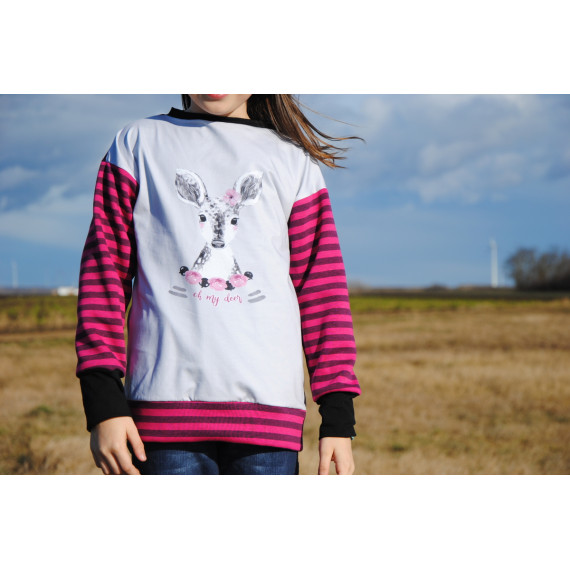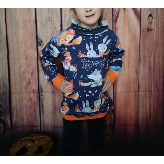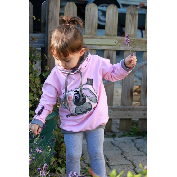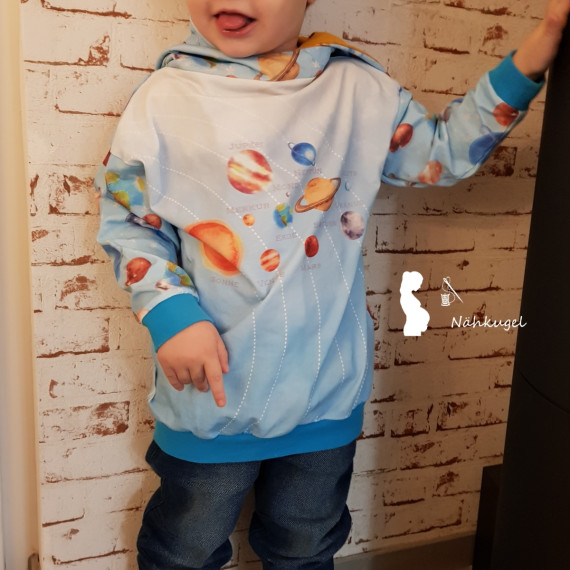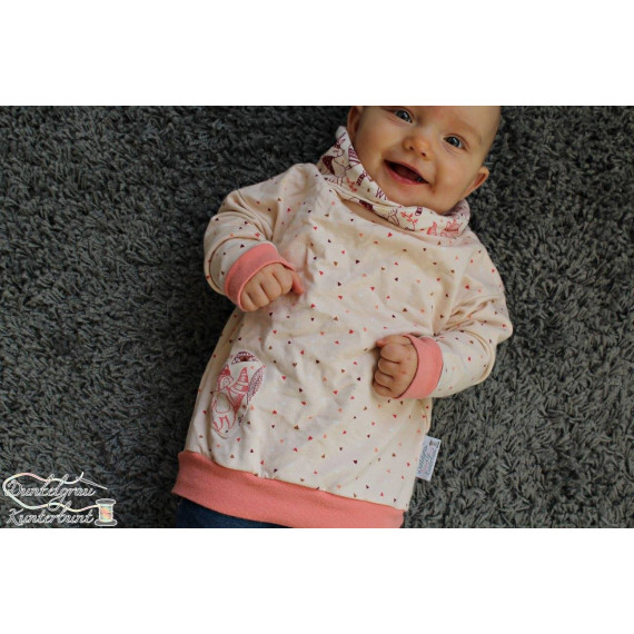 „Enna“ ist ein Pullover mit raffiniertem Kragen und peppigen Teilungen auf der Rückseite. Auf der Vorderseite kann außerdem noch eine Bauchtasche aufgenäht werden, damit die Kleinen ihre Hände wärmen oder fleißig Steine, Kastanien, Blätter oder andere wichtige Dinge verstauen können. Zudem hat „Enna“ einen lässigen Oversize Look mit überschnittenen Schultern. Dadurch, dass der Pullover also etwas weiter ausfällt, kann in den kalten Wintermonaten problemlos ein Longsleeve darunter getragen werden. Zusätzlich empfehle ich einen kuscheligen Loop oder ein Tuch, das den Hals wärmt, denn hoch geschlossen ist „Enna“ nicht. In den langsam kühler werdenden Monaten ist dieses Lieblingsstück also perfekt geeignet, um die Kleinsten ausreichend zu wärmen, aber auch genug Bewegungsfreiheit beim Toben und Spielen zu geben. Beim Stoff sollte man auf dehnbare Materialien wie Sweat oder Strick zurückgreifen, die ein bisschen dicker und kuscheliger sind.