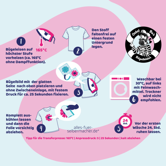 Auf jedem Bogen findest Du das Logo von Onkel Bo, das ist Dein Probe-Bügelbild… damit kannst Du vor dem richtigen Aufbügeln einmal testen wie einfach es funktioniert.