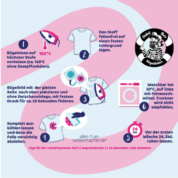 ACHTUNG! Eine Bügelpresse wird empfohlen, da man so alles auf einmal „aufbügeln“ kann.