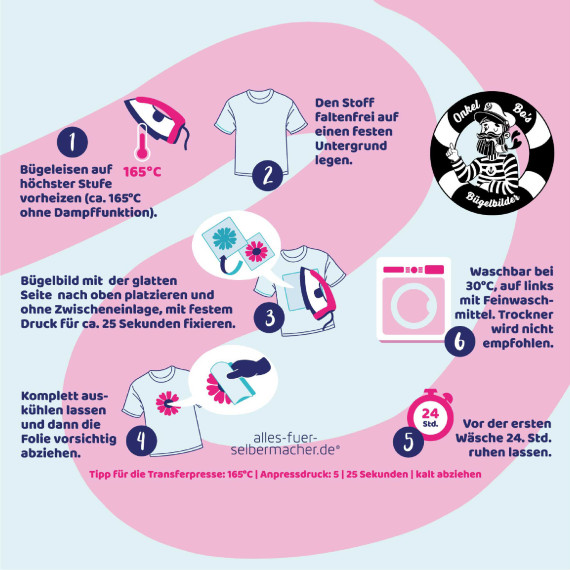 ACHTUNG! Eine Bügelpresse wird empfohlen, da man so alles auf einmal „aufbügeln“ kann.