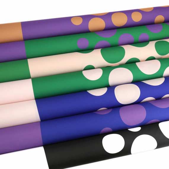 Toller Outdoorstoff mit unterschiedlich großen lilafarbenen Punkten und unterschiedlich breiten Streifen an dem linken Rand :)