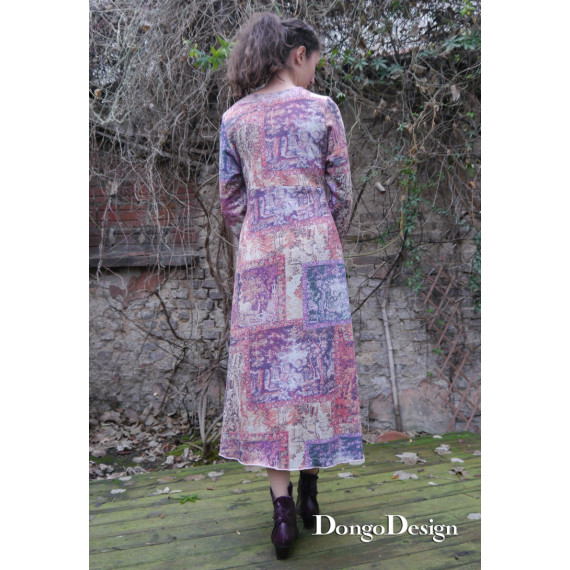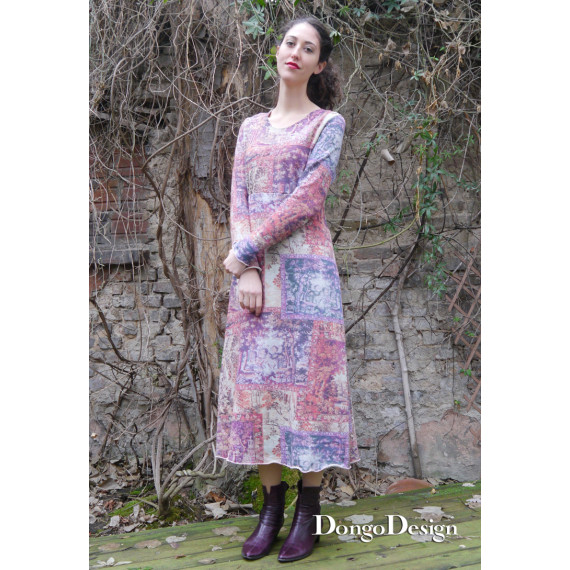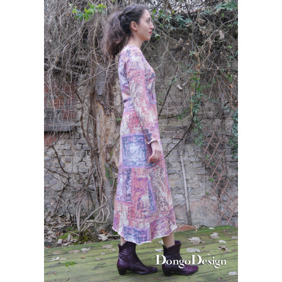 Das PDF Schnittmuster Angelika ist für Jerseystoffe konzipiert. Es hat eine unter der Brust verlaufenden Teilungsnaht, einen runden Ausschnitt und vorne zwei kleine Falten. Es gibt 2 Ärmelvarianten, einmal die auf den Bildern zu sehenden lange schmale Version und dann noch einen Dreiviertelärmel. Im Schnittmuster sind zwei Längenvarianten möglich, knielang und Midi.