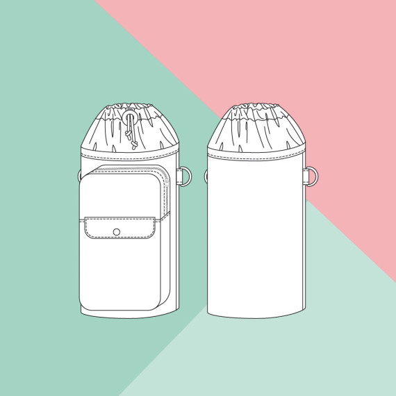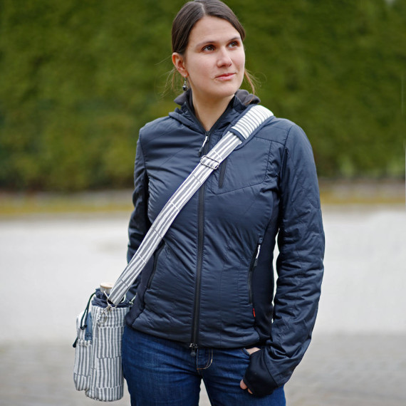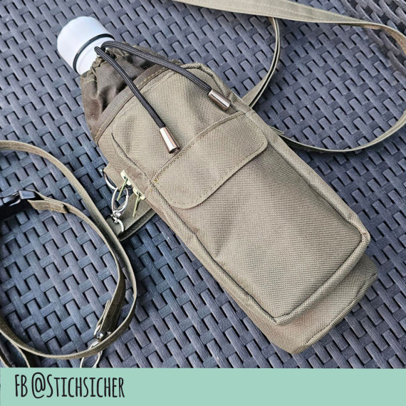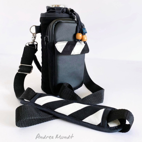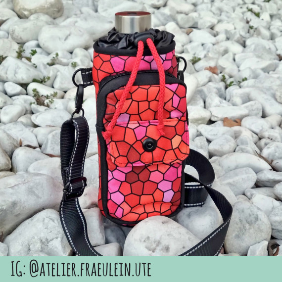 The Bottle Bag Walking is the ideal companion when it comes to hiking, walking, running, cycling, etc. The drawstring keeps the drinking bottle securely in the bag and the padding protects it from scratches and dents. The zippered pocket is intended for a smartphone or a small wallet. The carabiner in the pocket stores the key and is immediately at hand. An additional compartment at the front, which can optionally be closed with a Velcro fastener or Plastic push button, provides additional storage space. The pattern offers two different carrying options: with a padded shoulder strap or as a belt bag.