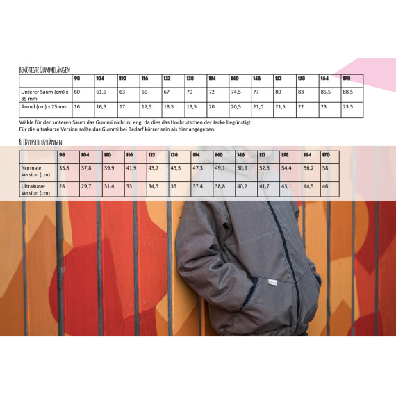 Das Schnittmuster enthält die Größen 98-170 und ist in A4 und A0-Format mit Ebenen enthalten.