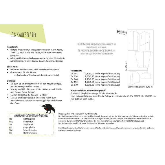Die Auswahl der zu verwendenden Stoffe ist schier unerschöpflich. Von Leinen, Tencel, Twill über Jeans, Cord und (Woll-)Teddy oder Walk. Piesepampel eignet sich für beinahe alle Webwaren. Dazu kannst du entschneiden ob du einglagig mit Belegen oder gefüttert, optional als Wendejacke nähen möchtest.