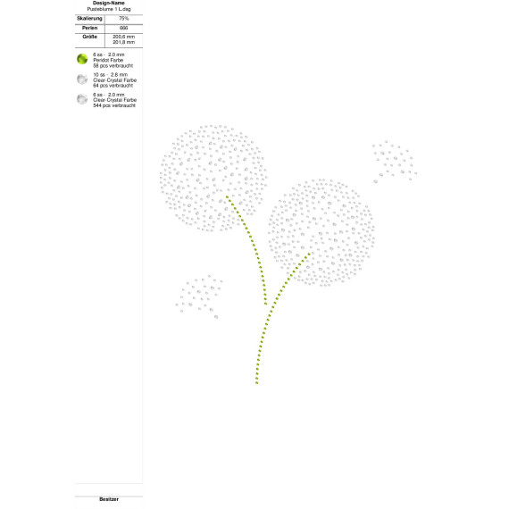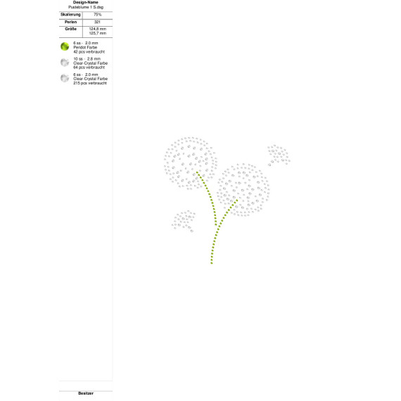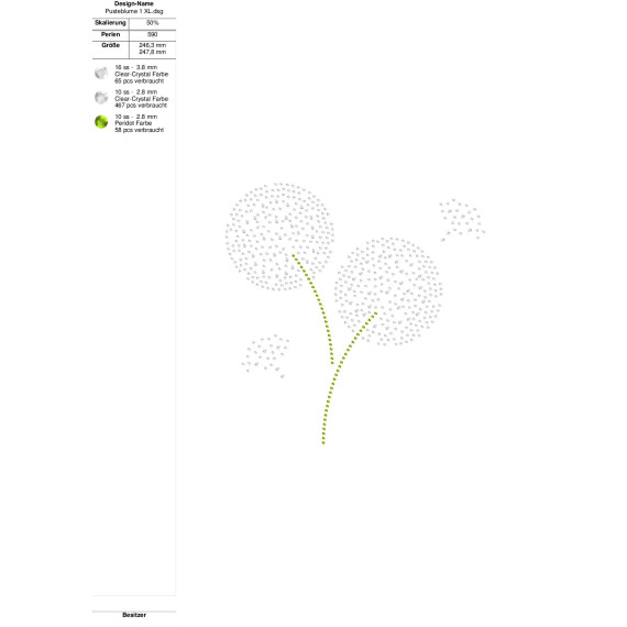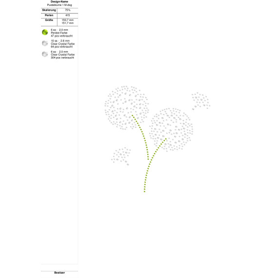 Benötigt wird ein handelsüblicher elektronischer Schneideplotter mit einem für die Maße des Motivs passenden Schnittbereich sowie der Möglichkeit eines der nachfolgend genannten Dateiformate lesen und verarbeiten zu können: DXF, SVG; Des Weiteren werden passendes Schablonenmaterial, Hotfix-Transferfolie, Strass-Steine in der jeweils passenden Größe sowie ein Bügeleisen benötigt. Zum Öffnen und Bearbeiten der Datei benötigst Du ein Plotterprogramm oder ein Vektor-Grafik-Programm. Für das Zusammensetzen von Hand wird ein handelsüblicher elektronischer DIN A4 Drucker benötigt sowie Software um das PDF Format öffnen und ausdrucken zu können. Des Weiteren werden Hotfix-Transferfolie, Strass-Steine in der jeweils passenden Größe sowie ein Bügeleisen benötigt.