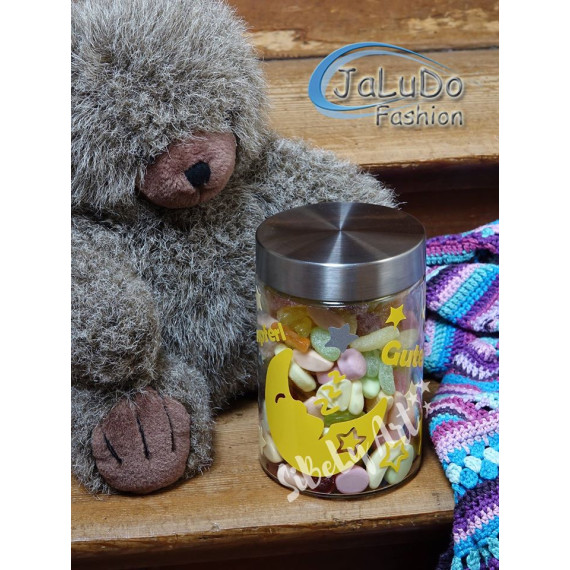 Enthalten sind ein schlafender Mond, ein wacher Mond, Kritzel Sterne, Sprüche wie z.B. Träum süß! etc.
