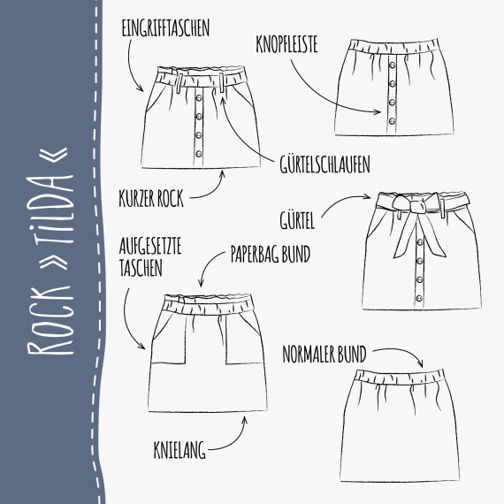 TILDA ist ein wandelbarer Rock, der sich durch zahlreiche Designoptionen an deinen Stil anpassen lässt. Mit zwei verschiedenen Längen, unterschiedlichen Taschenvarianten, einer optionalen Knopfleiste sowie praktischen Gürtelschlaufen und Gürtel kannst du deinen individuellen Look kreieren. Wähle zwischen einem klassischen Bund oder einem trendigen Paperbagbund, um TILDA genau nach deinem Geschmack zu gestalten.