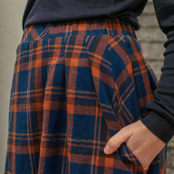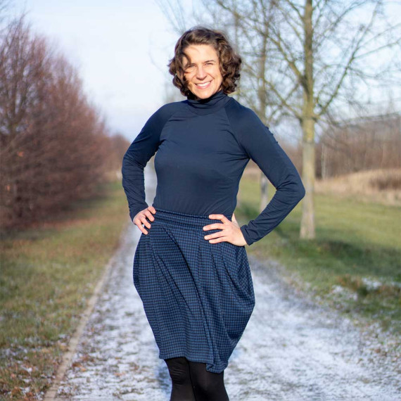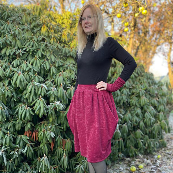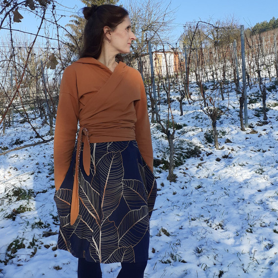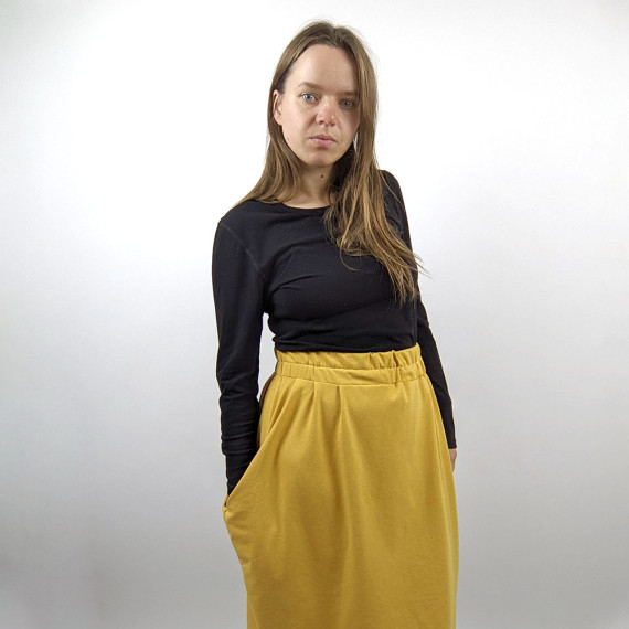 Aalto ist ein bequemer Rock mit seitlichen Wasserfall-Falten, in denen versteckte angeschnittene Taschen integriert sind. Der Bund wird mit einem bequemen Gummizug genäht. Du kannst zwischen der nach unten enger werdenden und der geraden Variante wählen.
