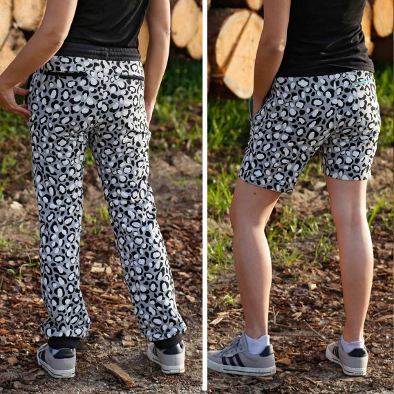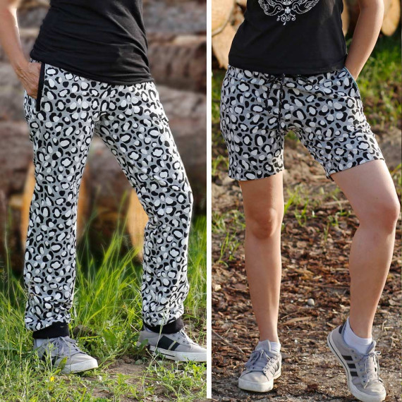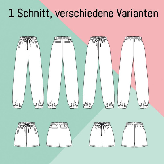 Die Jogginghose kann sowohl als kurze als auch als lange Hose genäht werden. Wähle zwischen eleganten Leistentaschen mit oder ohne Reißverschluss, praktischen Reißverschlusstaschen oder einer schlichten Variante ohne Taschen. Die lange Jogginghose ist mit einem gemütlichen Beinbündchen versehen, während die kurze Hose mit einem Saum überzeugt. Der elastische Hosenbund besteht aus zwei Gummibändern und einer Kordel, die durch Ösen oder Knopflöcher gefädelt wird. Lasse deiner Kreativität freien Lauf und kombiniere die verschiedenen Varianten ganz nach deinem persönlichen Stil.