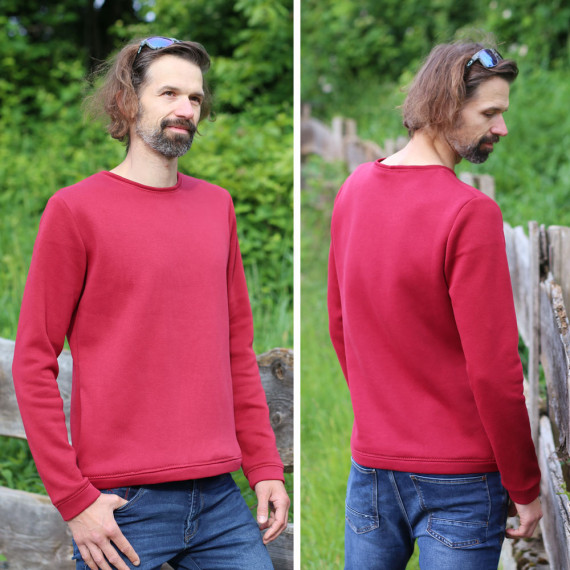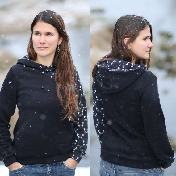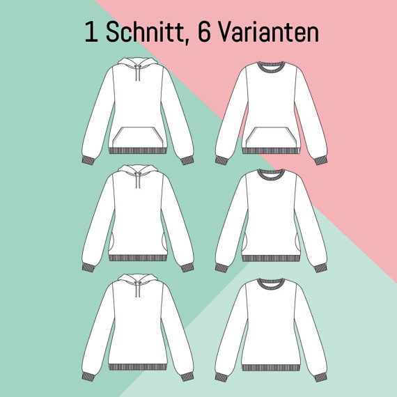 Der langärmlige Pullover kann mit Halsbündchen oder als Hoodie mit Kapuze genäht werden. Die Kapuze kannst du mit Ösen und einer Kordel verzieren. Außerdem hast du die Wahl zwischen einer Beuteltasche, keiner Tasche oder zwei seitlichen Taschen. Kombiniere nach Lust und Laune die Varianten untereinander. Der Schnitt fällt eng und tailliert aus.