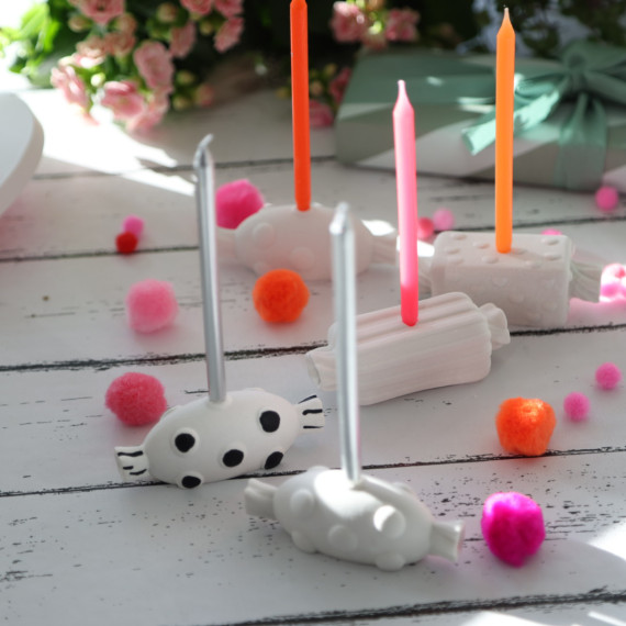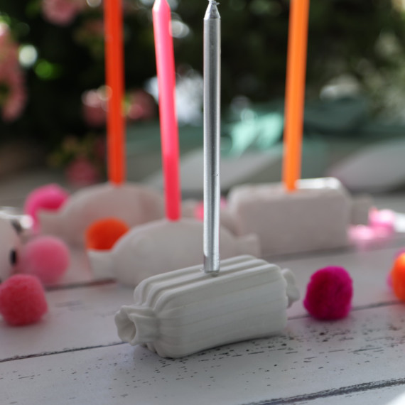 Die Bonbon-Kerzenhalter für Geburtstagskerzen gibt es in 3 Designs - hier bestellst Du den mit Streifen :)