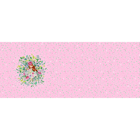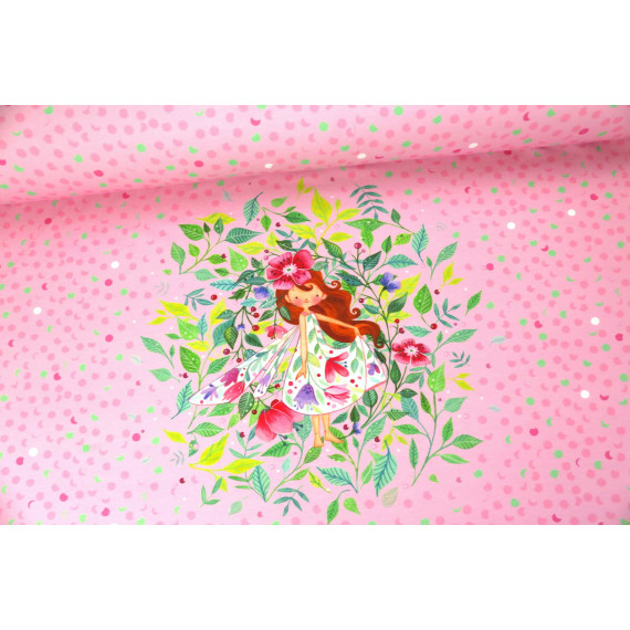 Auf diesem Paneel ist eine süße Blütenelfe, umgeben von Blättern und Blumen auf einem rosa, pink und grüngepunkteten Hintergrund.